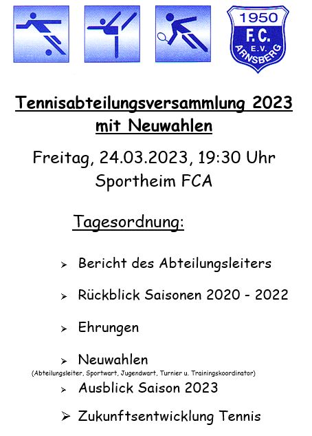 Am Freitag, den 24.03.2023 um 19:30 Uhr findet die Tennisversammlung mit Neuwahlen statt. Alle interessierten Mitglieder sind hierzu eingeladen. Hier ein Überblick von der Agenda.