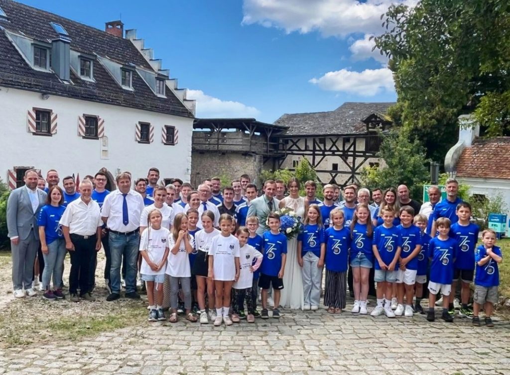 Laura Sturm und Max Rausch haben sich auf Schloss Arnsberg vor dem 1. Bürgermeister Christian Wagner des Marktes Kipfenberg das Jawort gegeben. Beide sind mit dem FC Arnsberg tief verwurzelt. Laura Sturm ist seit über 6 Jahren bereits Vorständin und Max Rausch seit seiner Jugend aktiver Fußballspieler und jetziger Co-Trainer der 1. Fußballmannschaft. So überraschten mehr als 50 Mitglieder, von den kleinsten Tanzmädchen und Bambini Kickern, Jugendtrainern, Fußballern, Vorstands- und Ehrenmitgliedern mit Ehrenvorstand und Ehrenvorsitzenden das jung vermählte Paar. Schriftführerin Anna Finster überreichte einen Blumenstrauß in den Vereinsfarben Weiß / Blau und wünschte ihnen für ihren gemeinsamen Lebensweg alles erdenklich Gute.