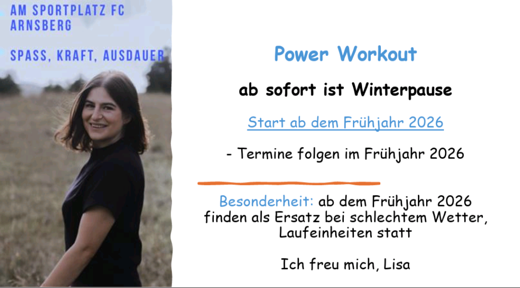 Für alle mit viel Energie bieten wir ein Power-Workout als stärkendes und individuelles Ganzkörpertraining an. Dabei arbeiten wir mit unserem eigenen Körpergewicht, um bei verschiedenen Übungen unsere Körpermitte zu stärken. Eine abwechslungsreiche Sportstunde zur Stärkung der Balance, zur Entwicklung eines guten Körpergefühls und zum Spaß am gemeinsamen Beisammensein. Die Trainingseinheiten finden unter Leitung von Lisa Blechinger auf den Sportplätzen des FC Arnsberg statt. Bei schlechtem Wetter entfällt die Stunde.